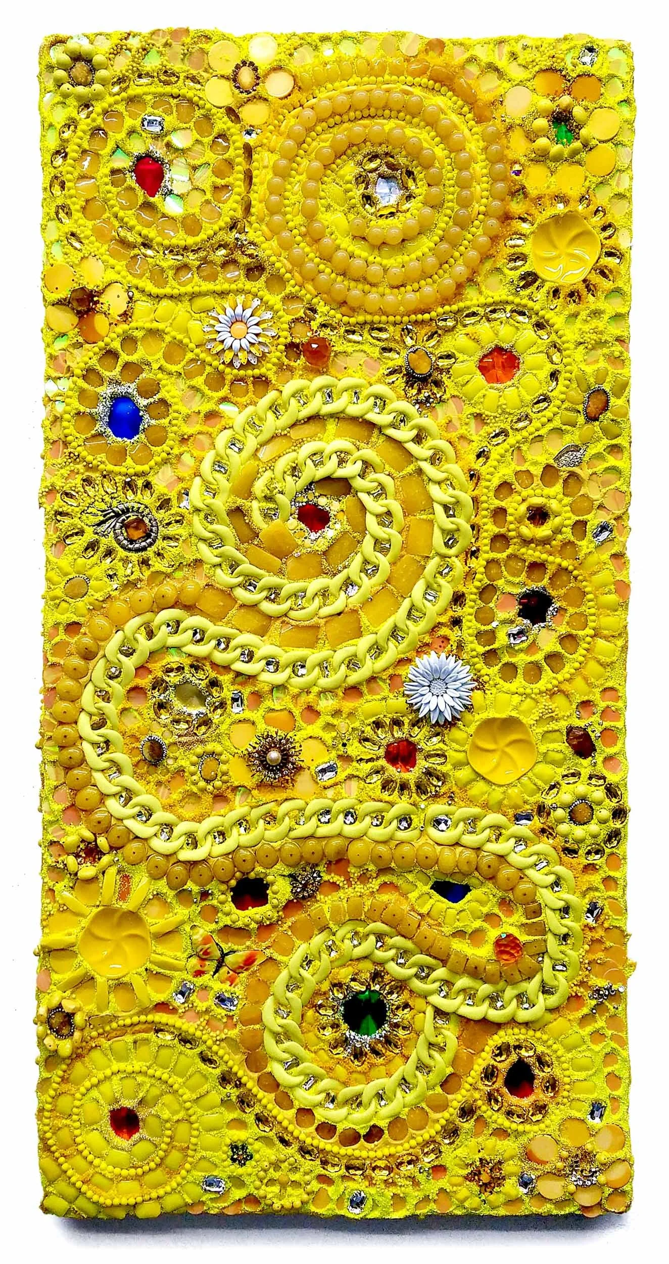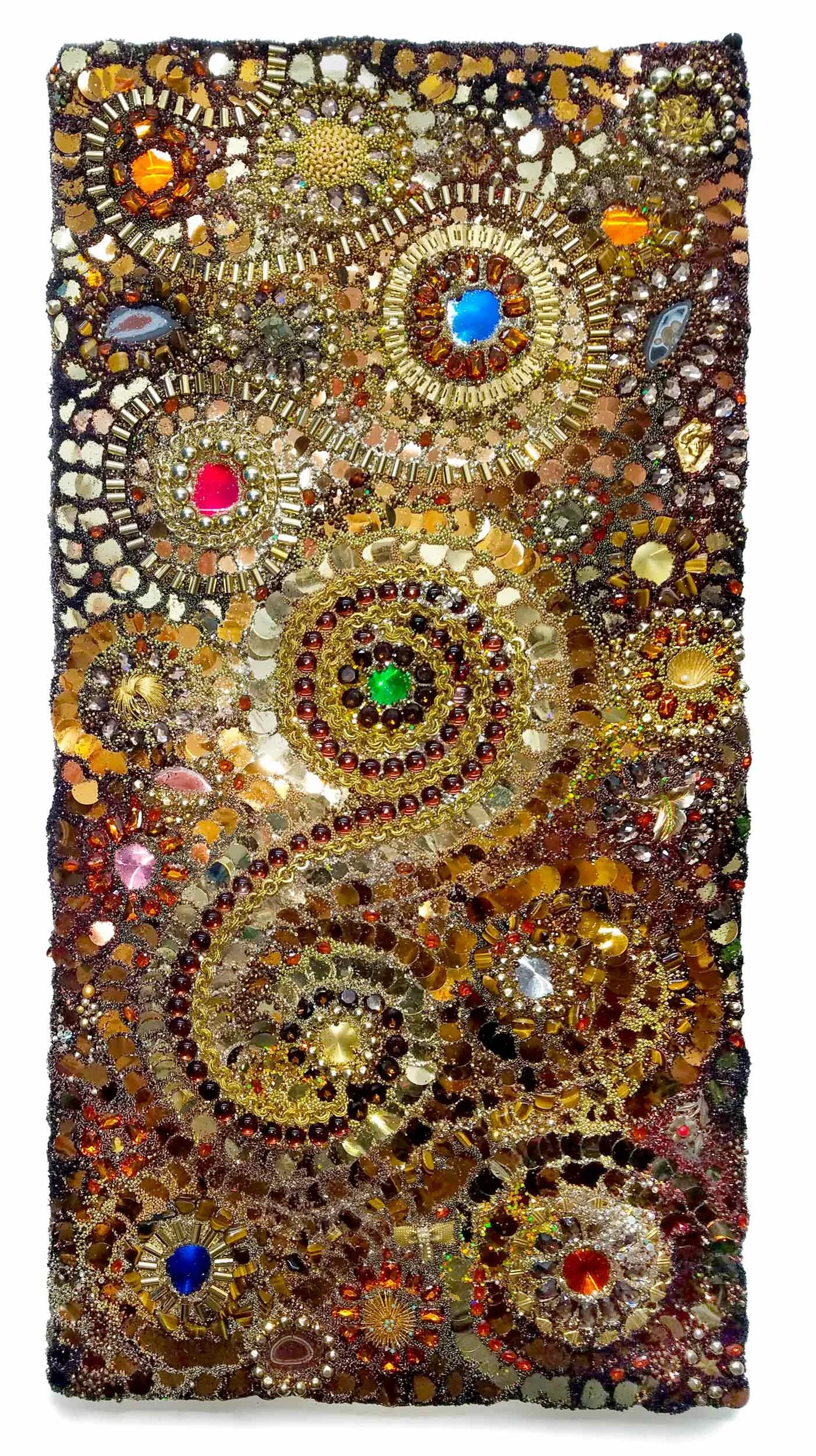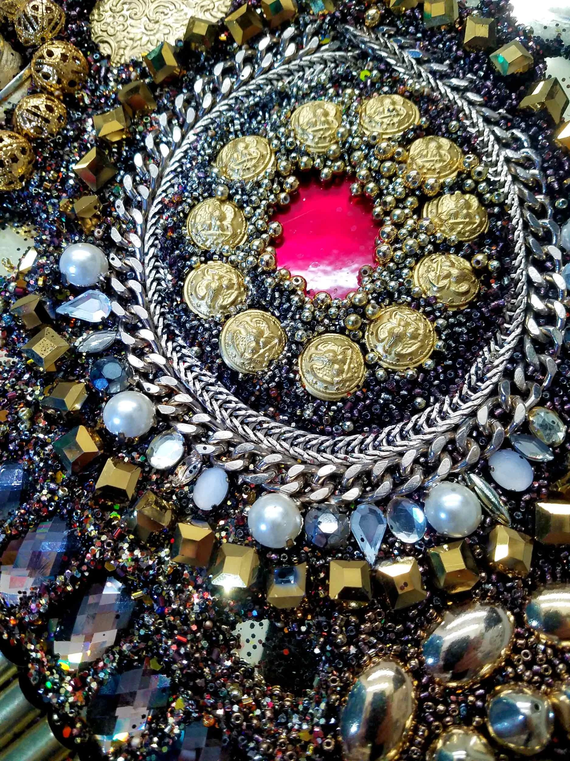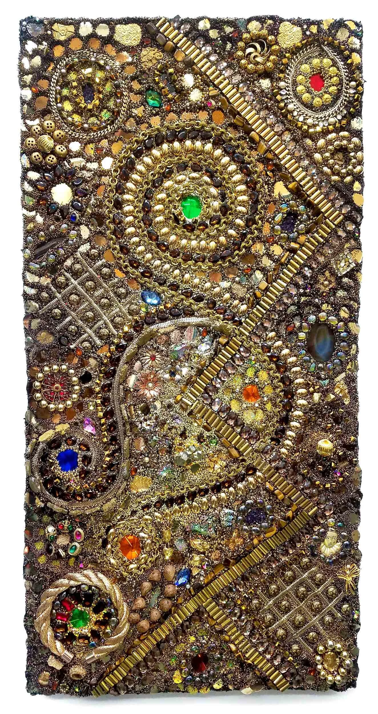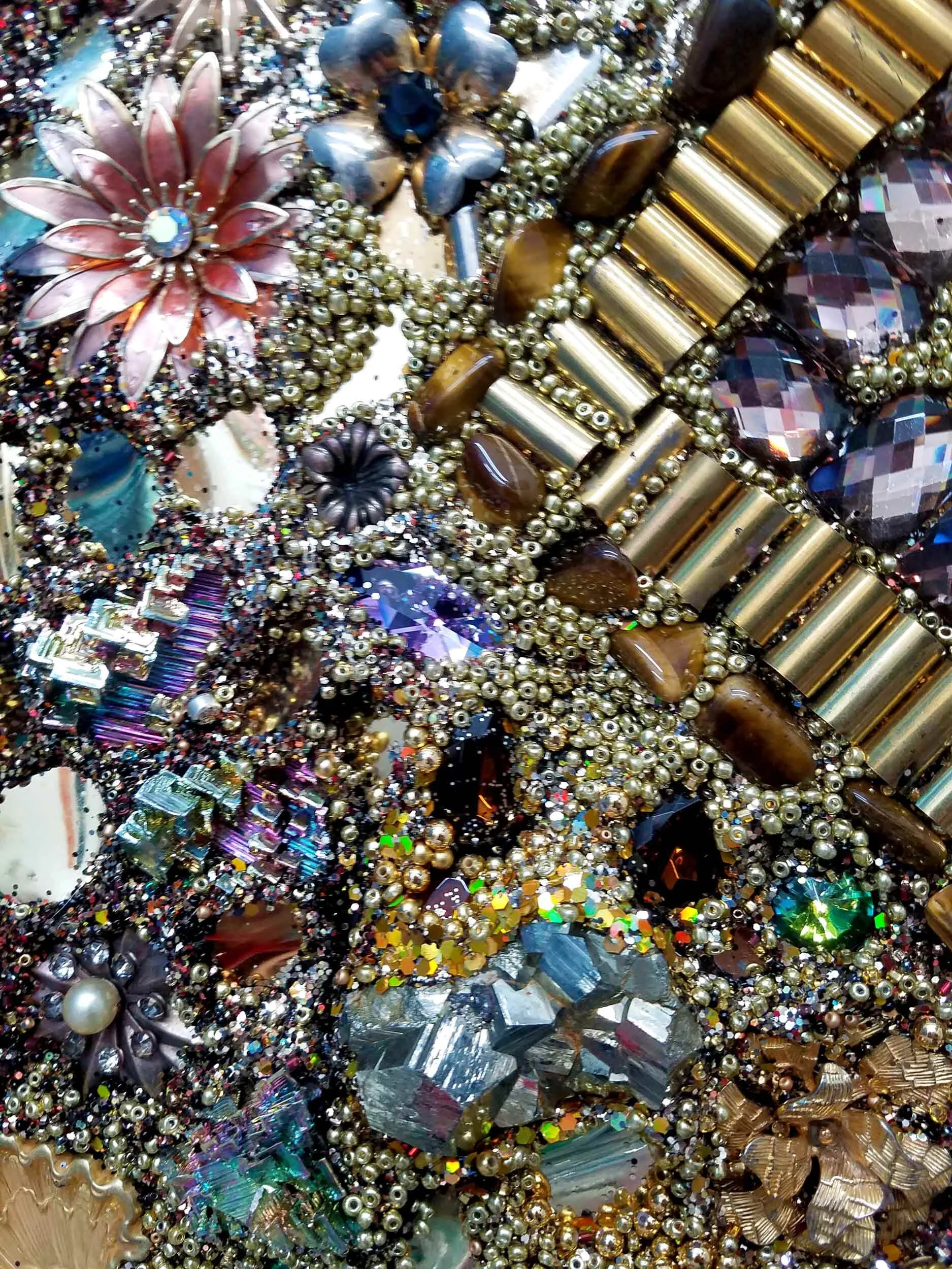 Glitter, paillettes, jewels, beads and mixed media on canvas