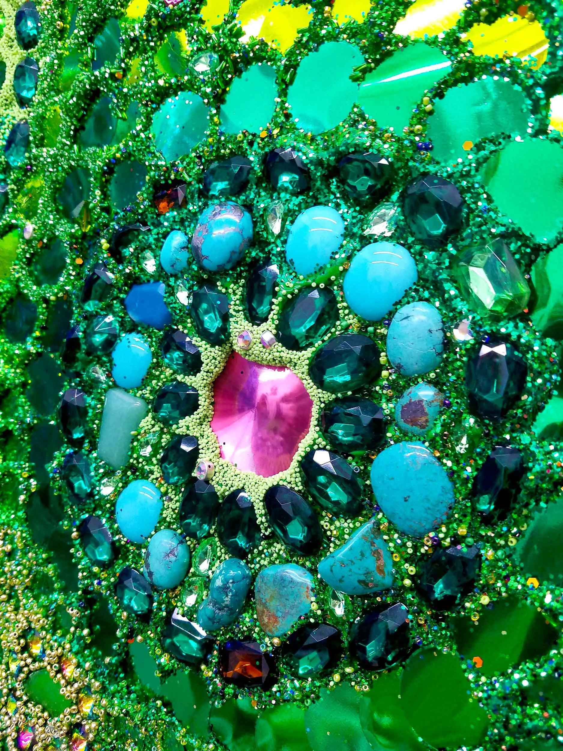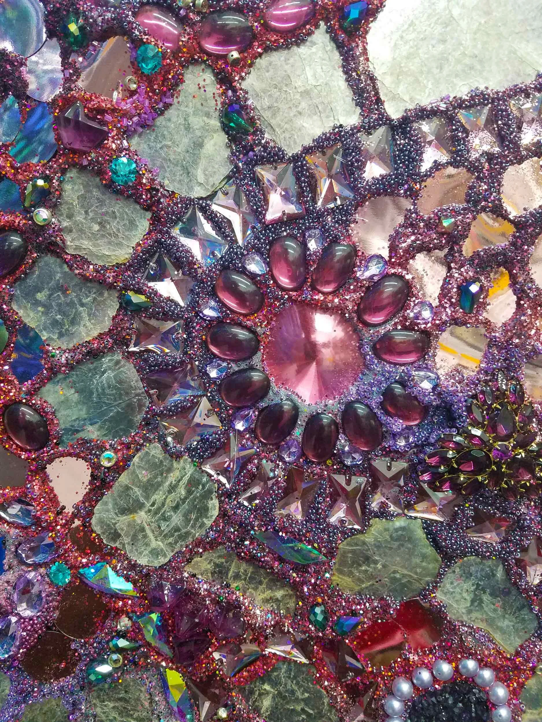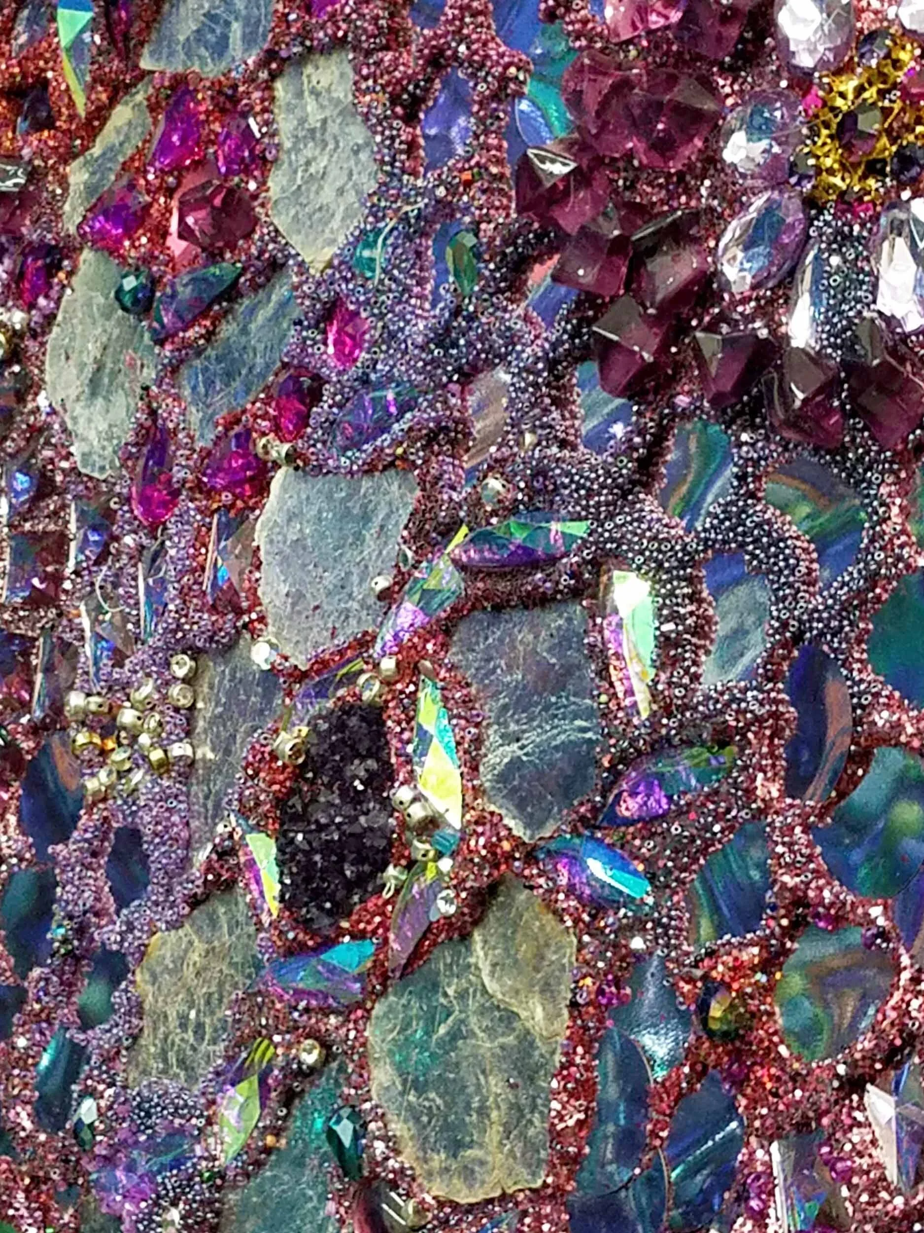 Glitter, paillettes, jewels, beads, fossils, amethyst, mica, geodes and mixed media on canvas