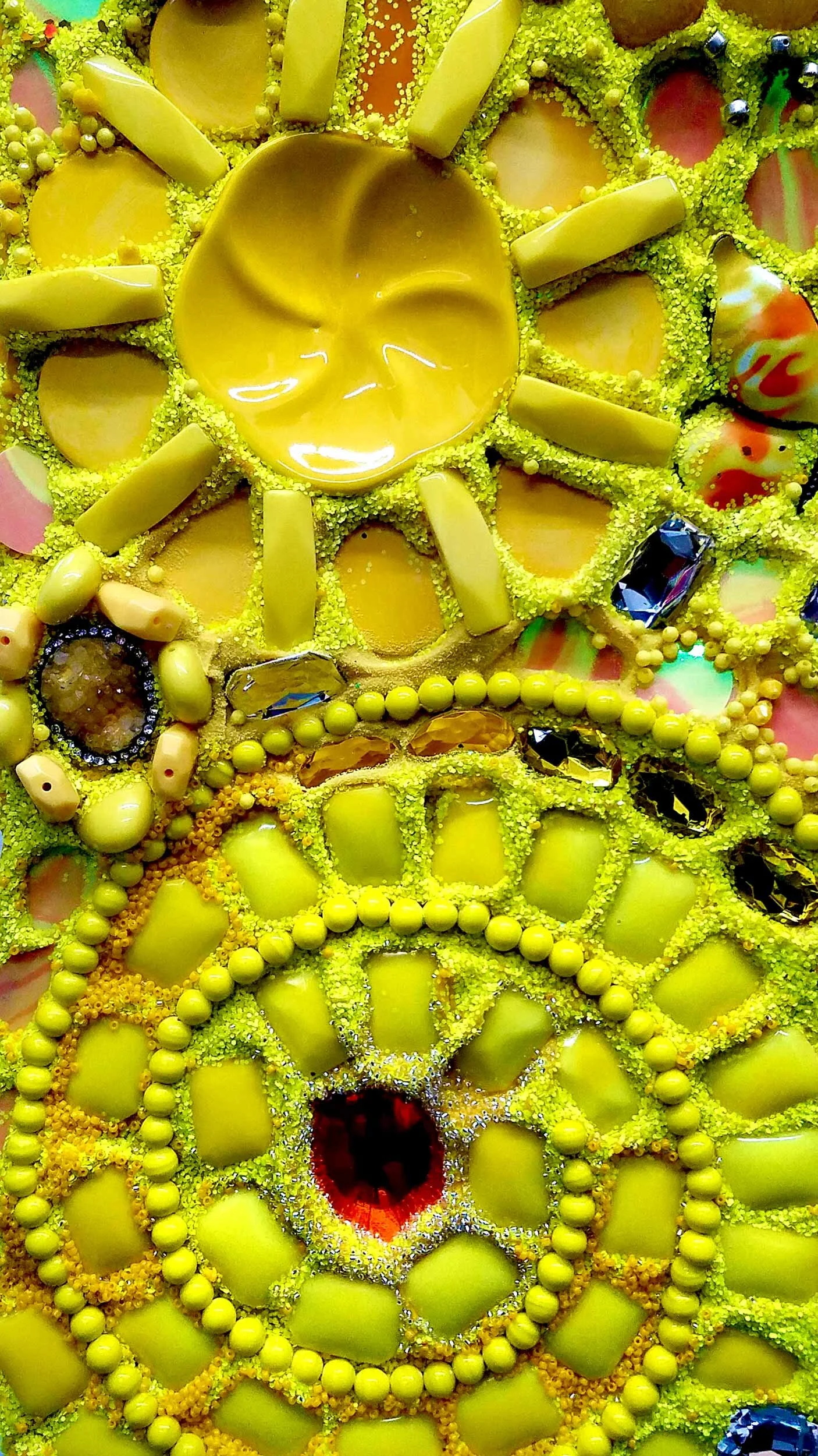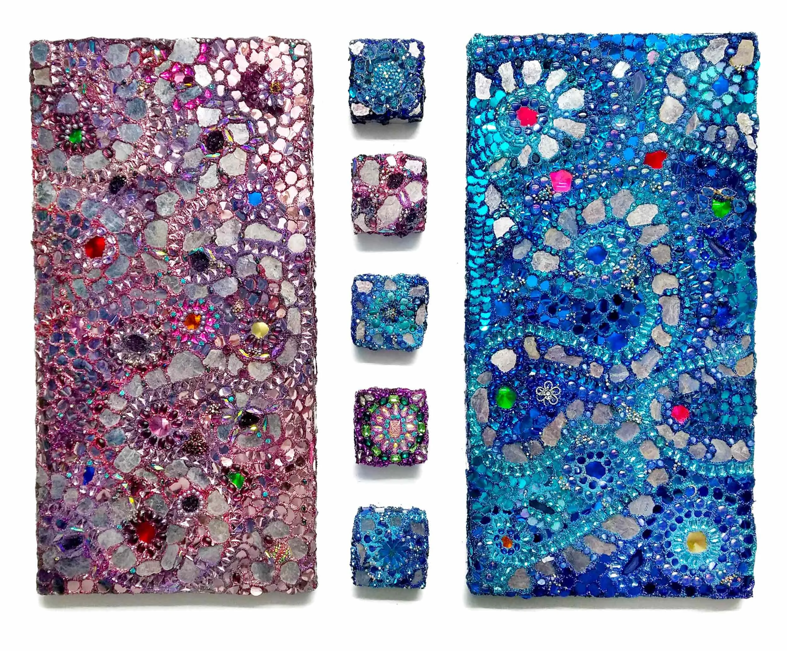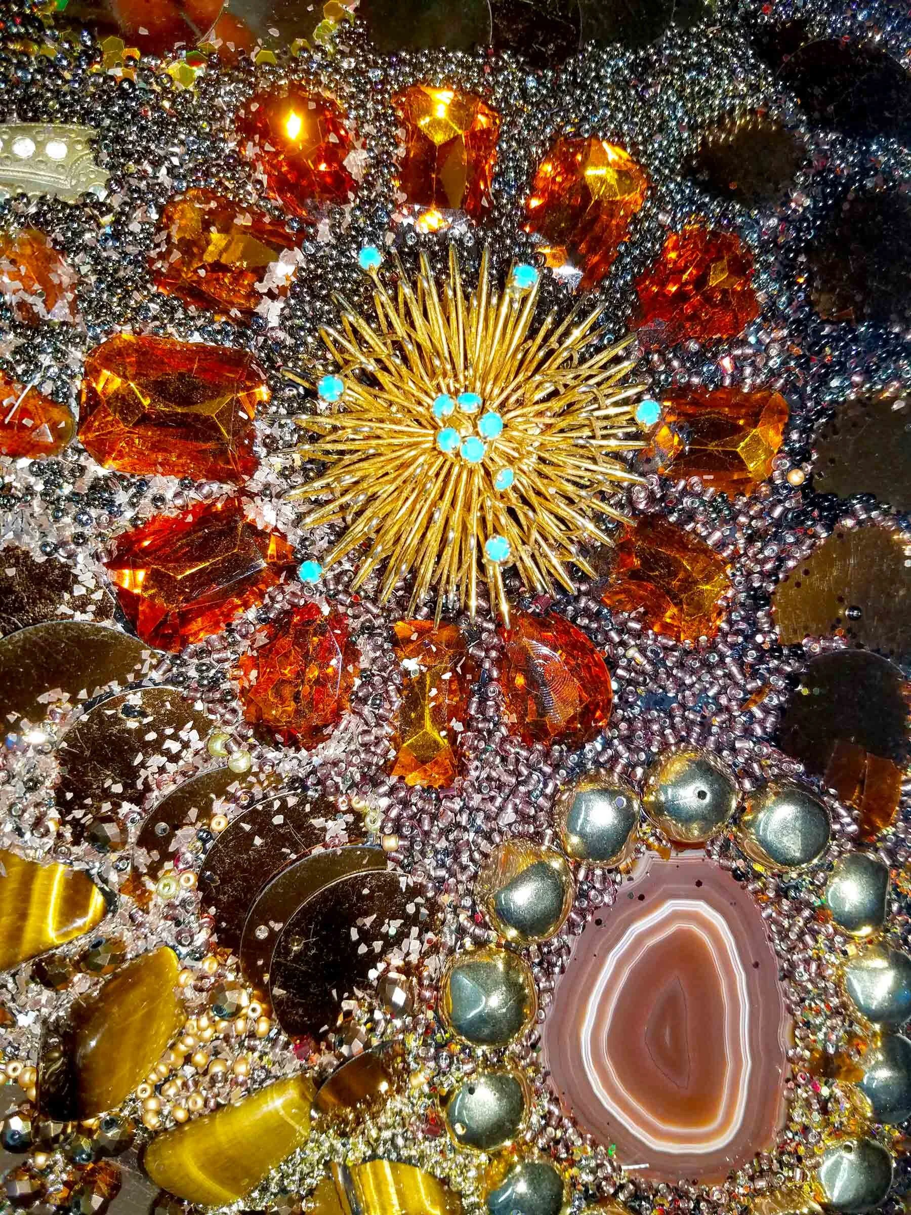 Glitter, paillettes, jewels, beads, fossils, amethyst, mica, geodes and mixed media on canvas