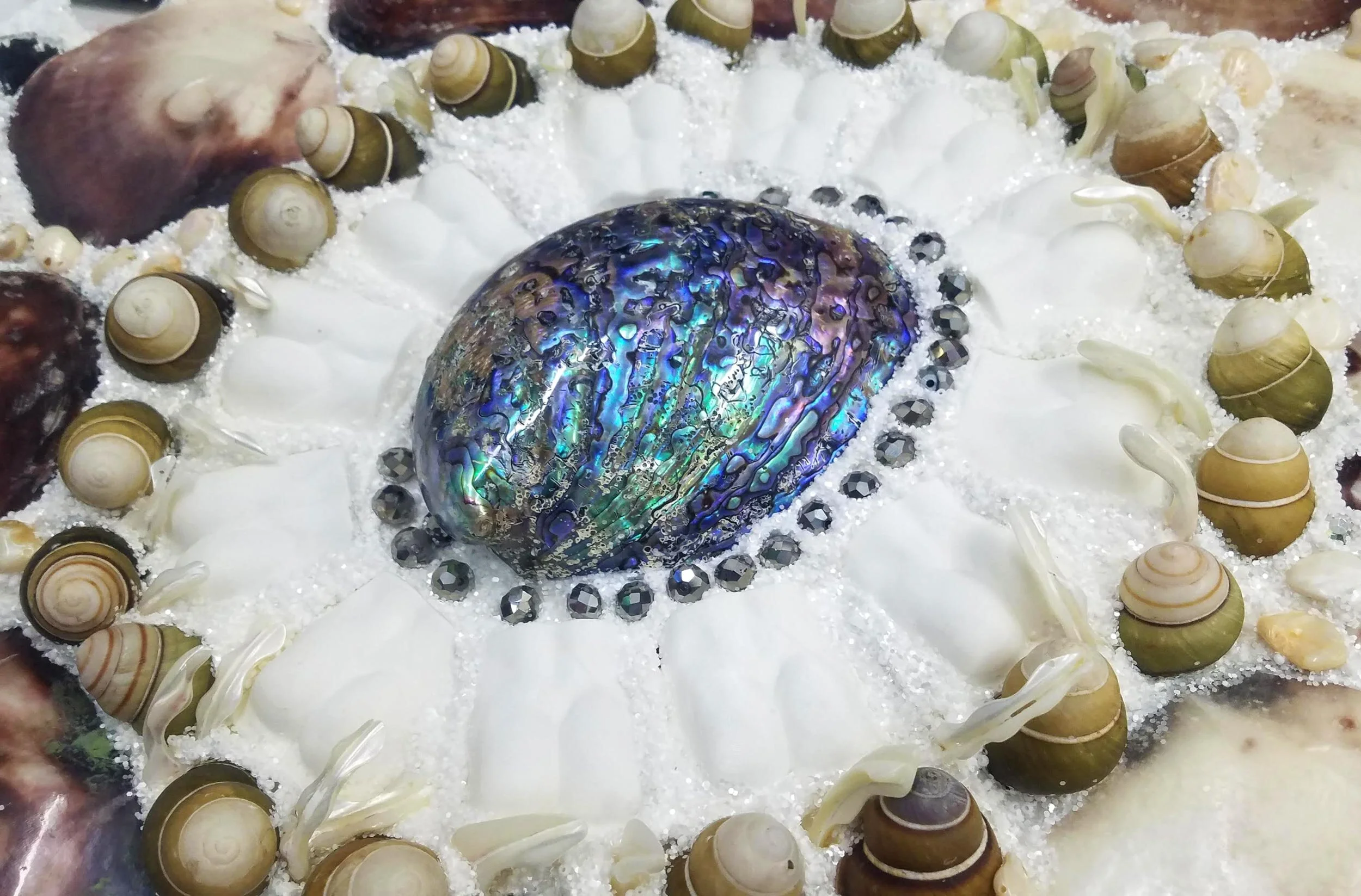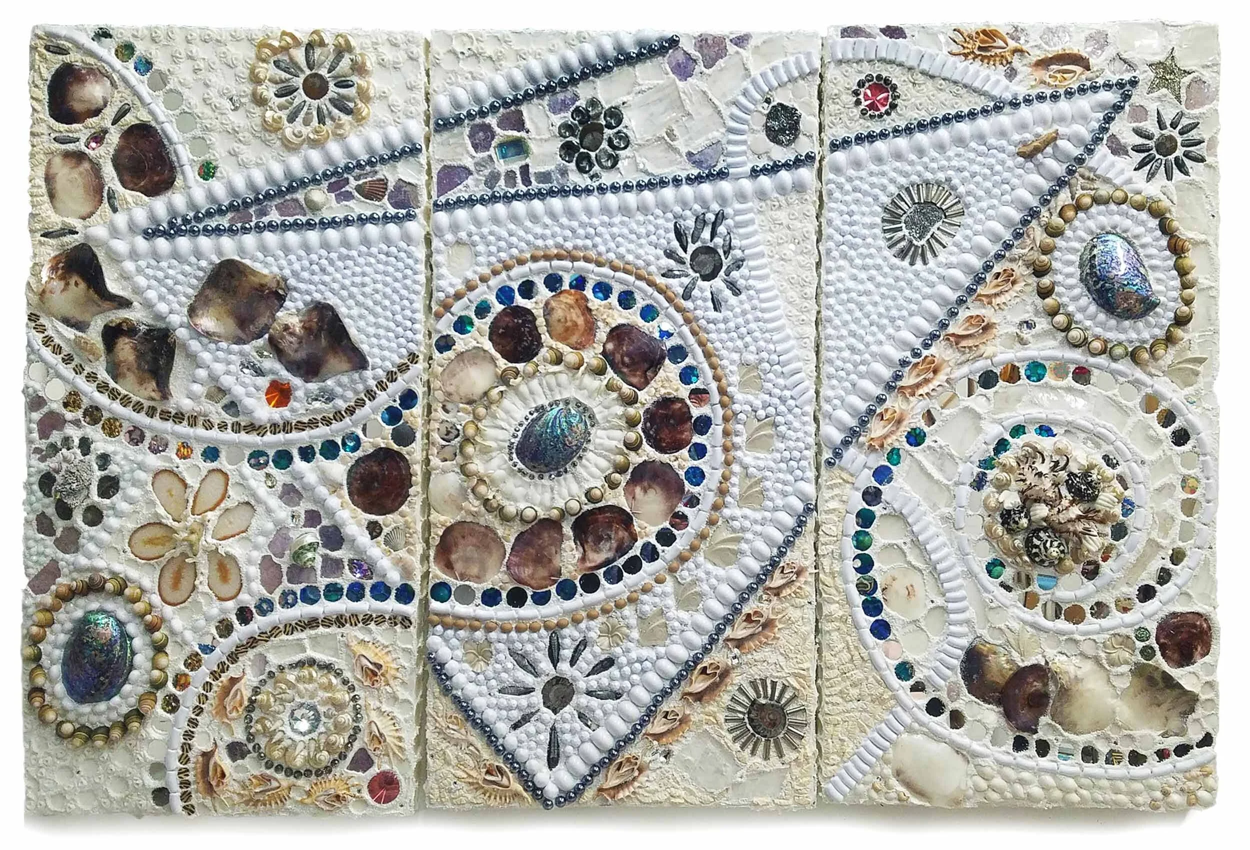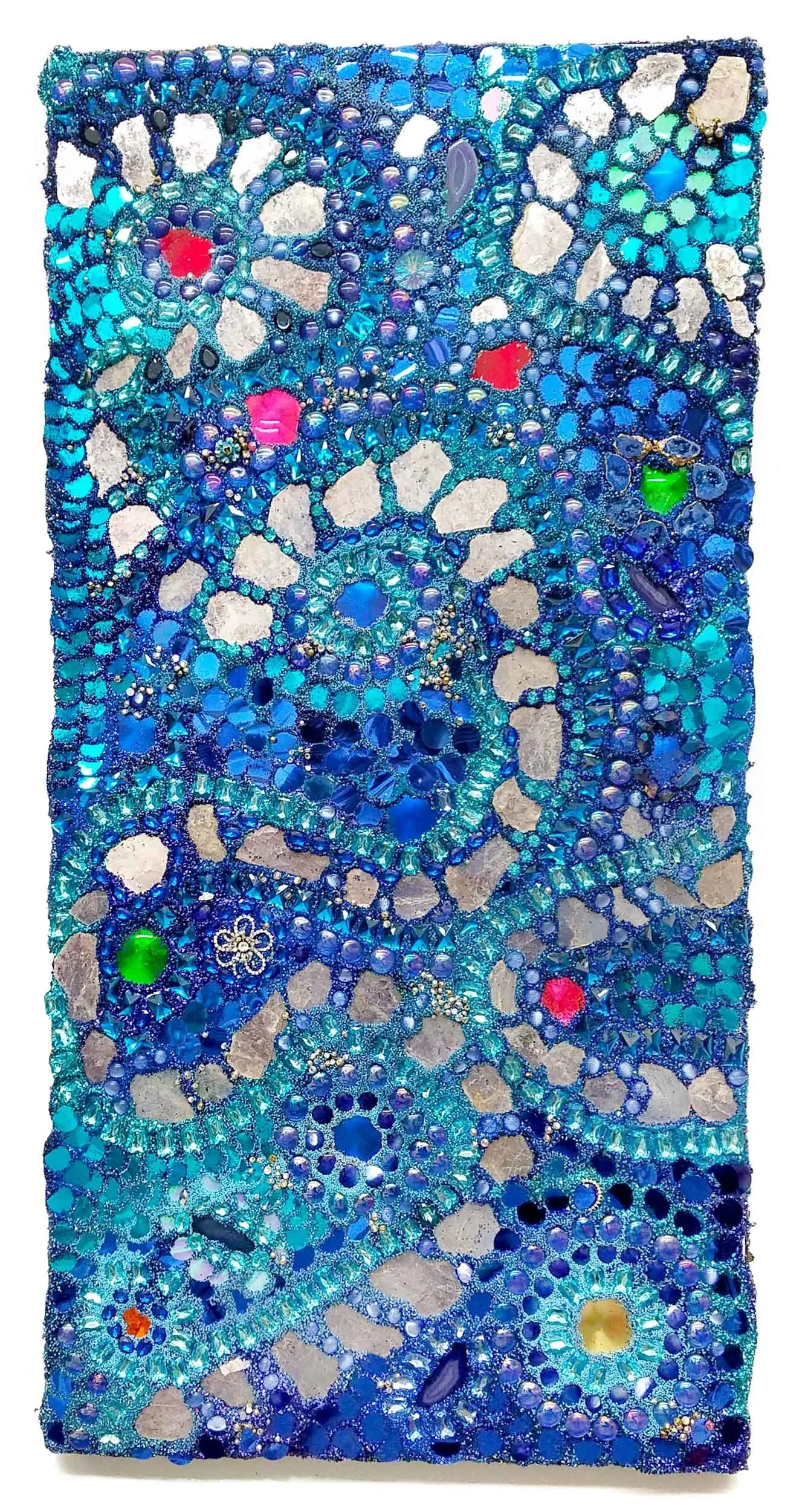 Glitter, paillettes, jewels, beads, fossils, mica, seashells and mixed media on canvas